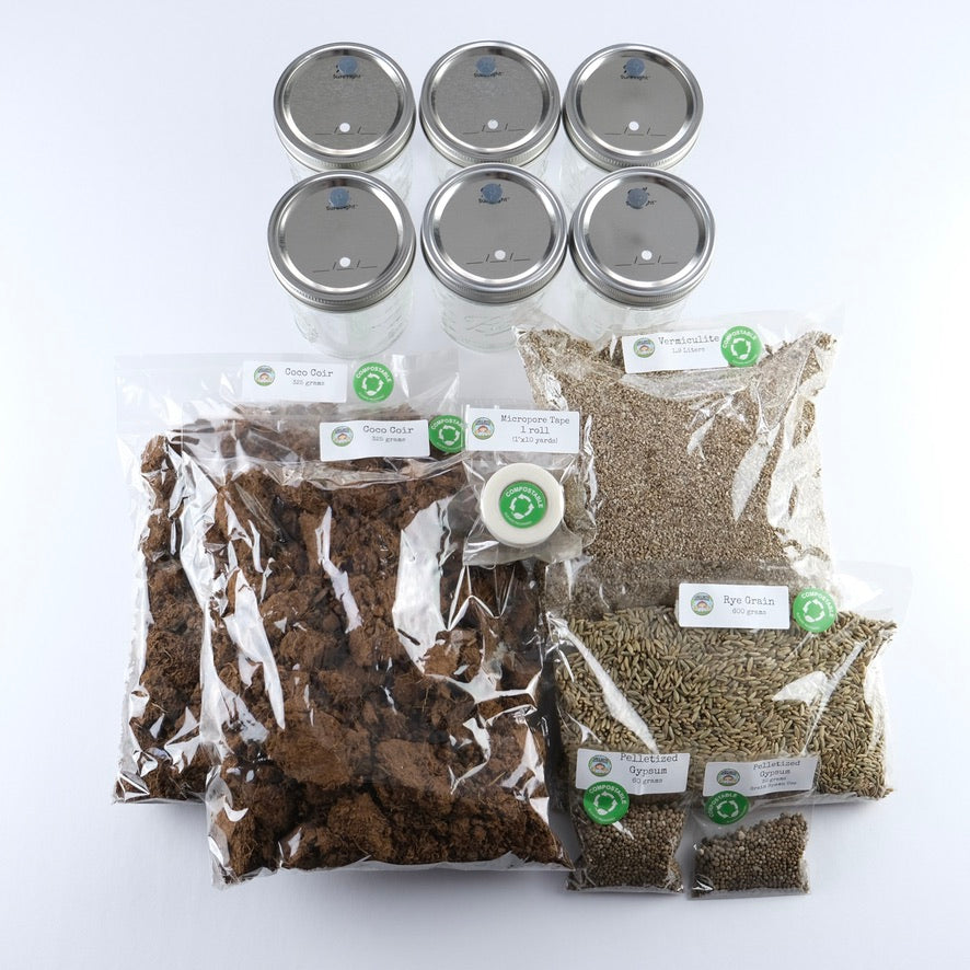 Thinking about growing mushrooms at home? This is the perfect place to start! Save yourself the frustration and expense of drilling spawn jar holes, locating all the individual ingredients, and measuring out ratios; our 50-70 liter starter kit has the essentials you'll need to dive into the wonderful world of fungi. This kit contains: